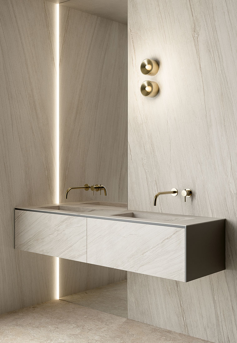 Dalle grandi lastre in gres porcellanato WIDEgres 6 mm nasce una gamma di soluzioni per lavabi, mensole e piatti doccia, tutte personalizzabili per adattarsi alle esigenze progettuali di designer e architetti.