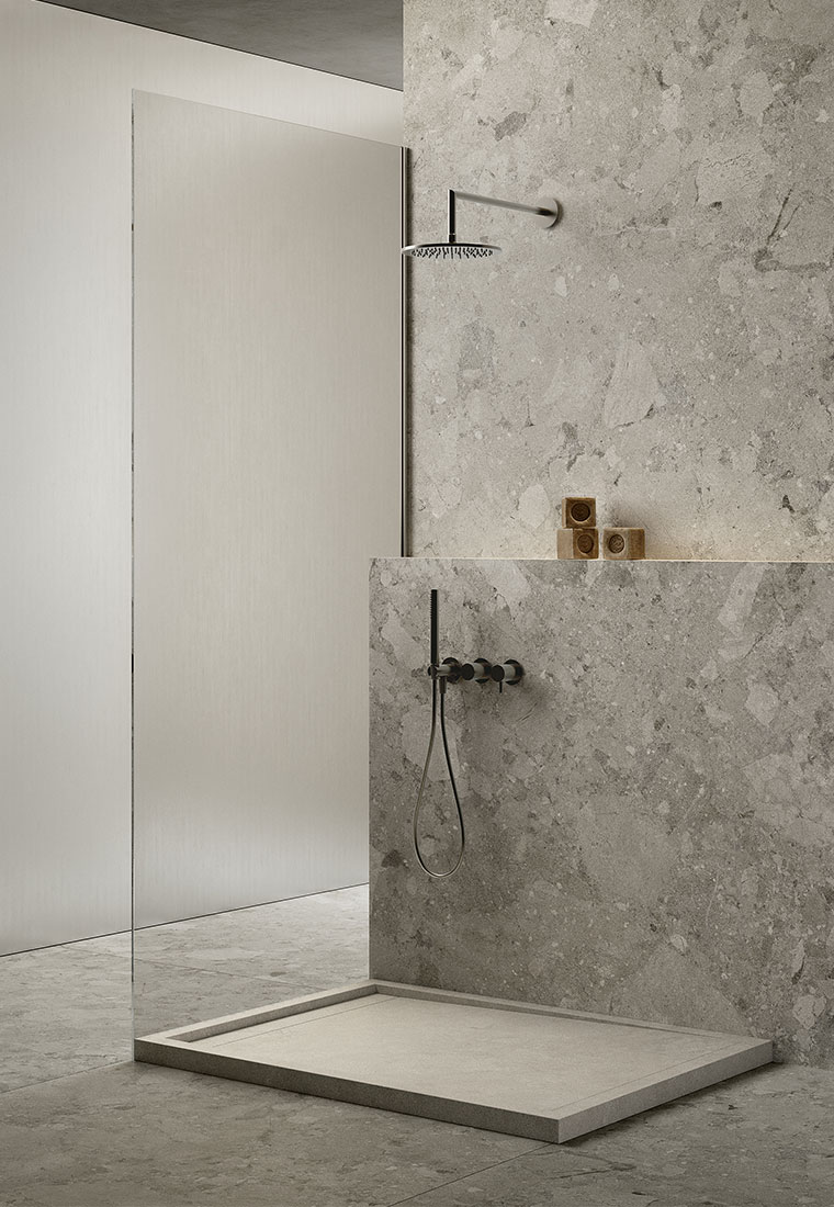 La forza dell’acqua prende forma in Cross, il piatto doccia ricostruito in cui quattro lastre si incontrano in un segno sottile che guida naturalmente lo sguardo e il flusso verso il punto di deflusso. Solido e durevole, si inserisce con eleganza in qualsiasi tipo di installazione, sia a filo pavimento che in appoggio, preservando coerenza estetica e materica. La superficie, perfettamente in continuità con le pareti in gres nella stessa finitura, amplifica una sensazione di benessere autentica e avvolgente.