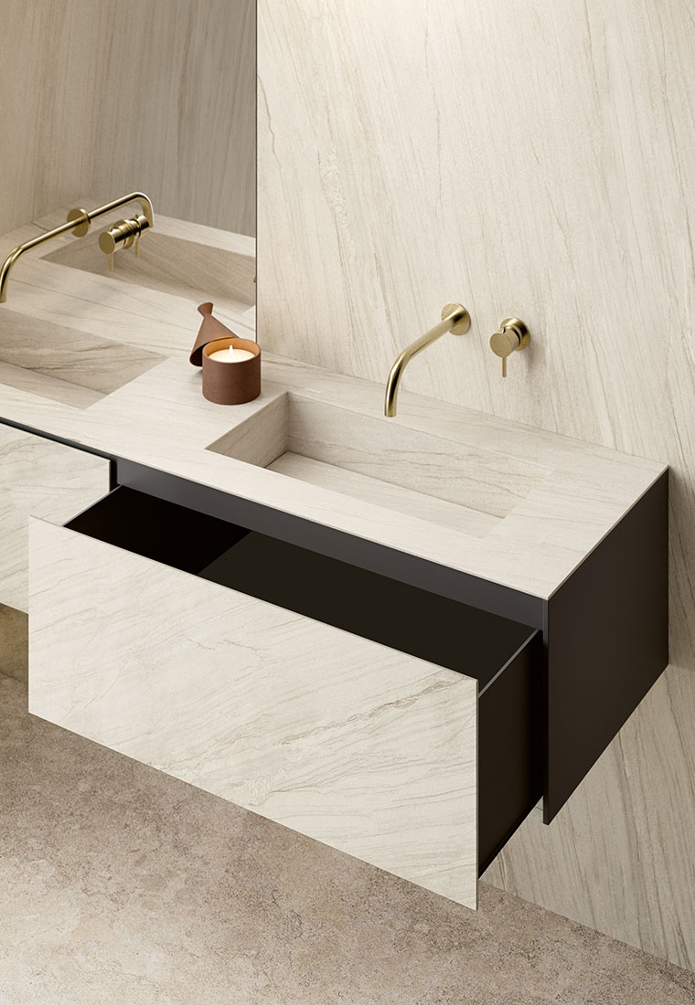 Eleganza e funzionalità si incontrano in Case, il lavabo con cassettone che restituisce al bagno un senso di ordine e armonia. Le sue linee contemporanee dialogano con la leggerezza delle lastre in gres da 6 mm, mentre l’ampio contenitore custodisce ogni elemento della quotidianità, traducendo un’estetica pensata per valorizzare il comfort in ogni gesto.