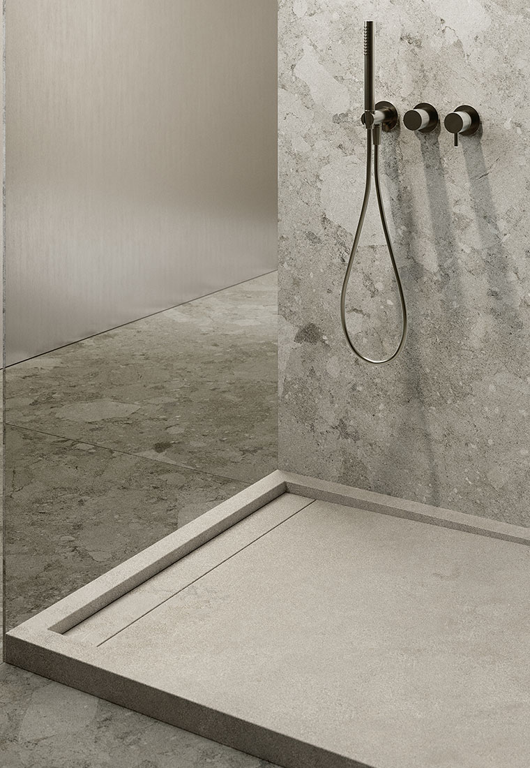 La forza dell’acqua prende forma in Cross, il piatto doccia ricostruito in cui quattro lastre si incontrano in un segno sottile che guida naturalmente lo sguardo e il flusso verso il punto di deflusso. Solido e durevole, si inserisce con eleganza in qualsiasi tipo di installazione, sia a filo pavimento che in appoggio, preservando coerenza estetica e materica. La superficie, perfettamente in continuità con le pareti in gres nella stessa finitura, amplifica una sensazione di benessere autentica e avvolgente.