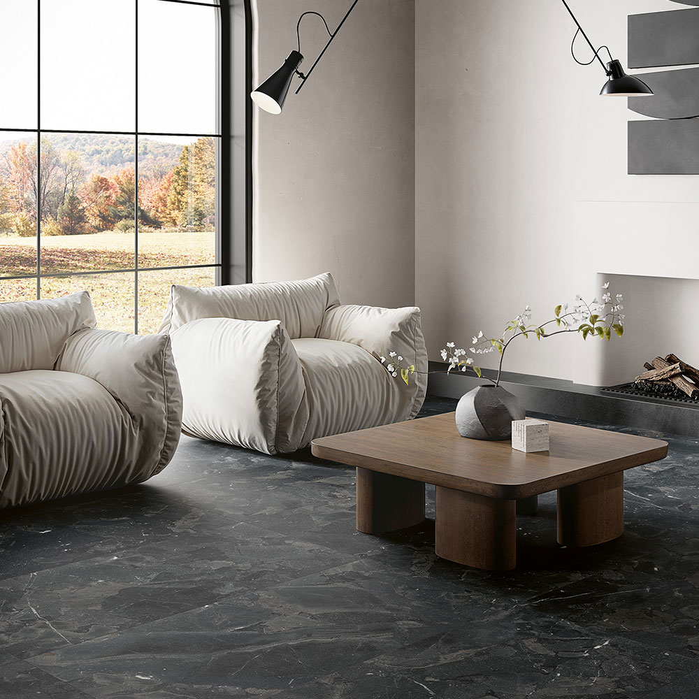 Collezioni come Sense e Lythos interpretano questa tendenza attraverso superfici morbide, caratterizzate da leggere variazioni cromatiche e texture profonde, capaci di valorizzare arredi in rovere naturale, noce o frassino. Sense, in particolare, rielabora la pietra Grey in un gres porcellanato effetto pietra dalla forte presenza materica, con colori e sfumature studiate per accogliere tavoli, sedie e complementi in legno, contribuendo a creare atmosfere calde e armoniose. Lythos, invece, trae ispirazione da una quarzite brasiliana e la traduce in pavimenti in gres effetto pietra ad alte prestazioni, ideali per dialogare anche con arredi in legno dalle lavorazioni più importanti. Il risultato sono spazi dal forte impatto scenico, dove materia e design convivono in perfetto equilibrio.