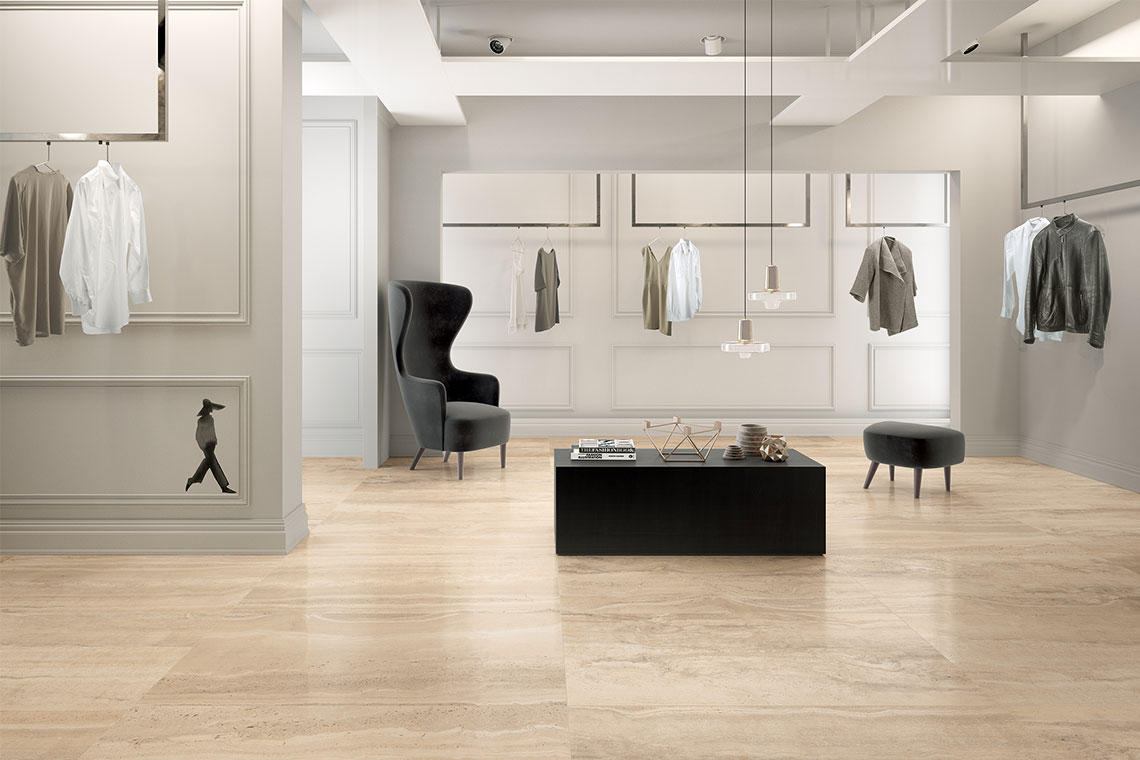 Negli spazi pubblici e commerciali prende forma un nuovo equilibrio tra matericità e dettaglio. Le superfici ceramiche declinate nei toni della terra – sabbia, argilla, pietra calda – diventano una base neutra e raffinata, ideale per valorizzare ambienti ad alta frequentazione con un’estetica accogliente ma rigorosa. In questi contesti, metalli caldi come ottone e bronzo introducono accenti sofisticati, capaci di arricchire lo spazio senza eccessi. Collezioni come Reverso e Kavastone interpretano questo dialogo con naturalezza, attraverso superfici sobrie e compatte che esaltano arredi contract, dettagli metallici satinati, ma anche sedute e tavoli in legno e atmosfere contemporanee.