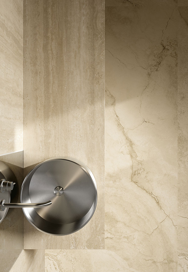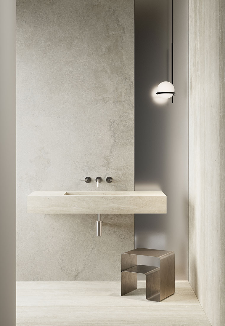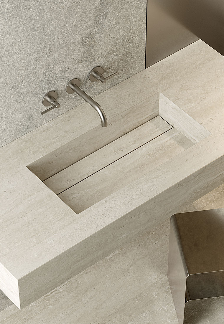 Jedes Element der Kollektion ist so gestaltet, dass es mit der Architektur im Dialog steht: die Waschbecken, Duschwannen und Waschbeckenregale sind darauf ausgelegt, elegante und einladende Räume zu schaffen, in denen visuelle und taktile Kontinuität Ausdruck des täglichen Wohlbefindens ist. Klare Linien und durchdachte Details erzählen von zeitlosem Design: einzigartig, langlebig und natürlich anpassbar an jedes Projekt, mit persönlichem Stil und Harmonie. Die großen WIDEgres280 Platten in 6 mm sorgen zudem für eine makellose ästhetische Kontinuität.