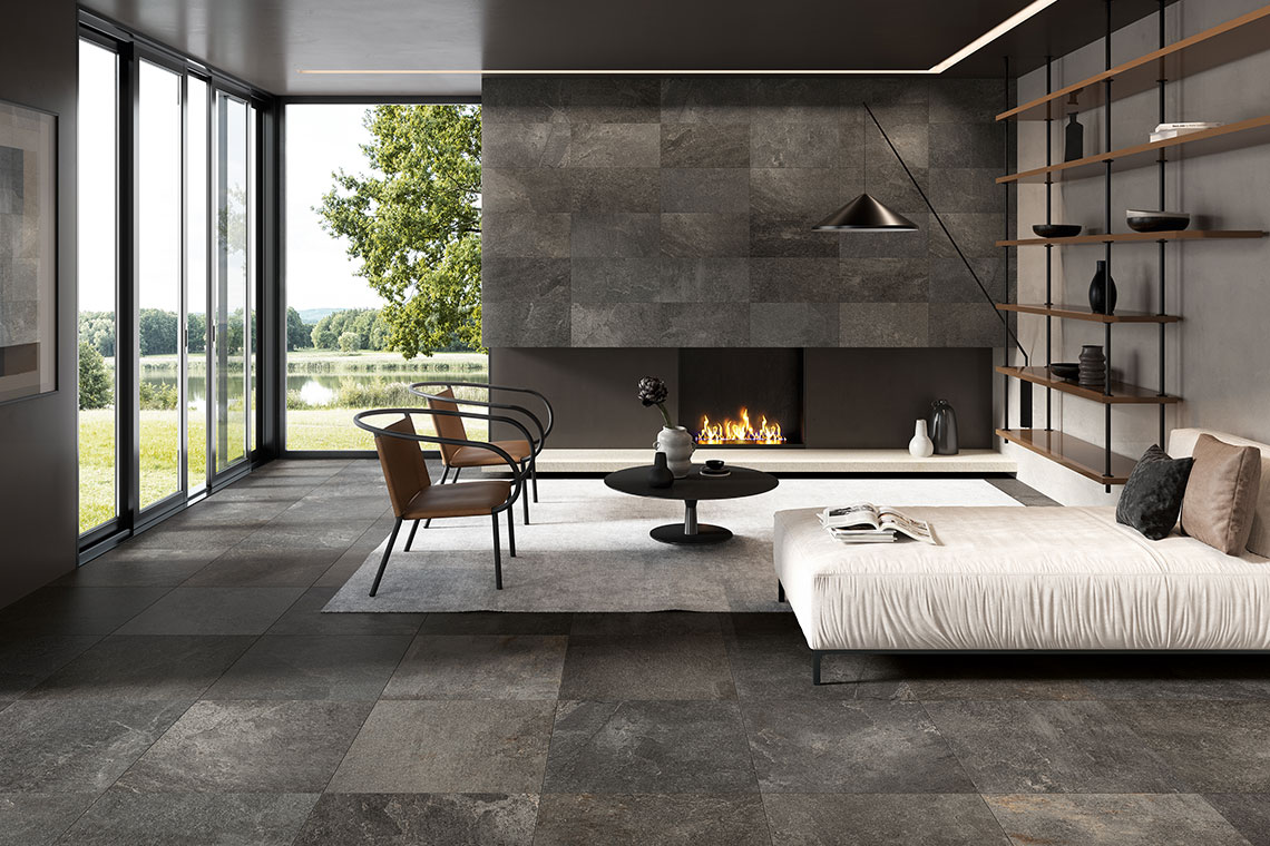 Collections such as Sense and Lythos interpret this trend with their soft surfaces, marked by subtle colour shifts and deep textures, designed to enhance furnishings in natural oak, walnut or ash. Sense, in particular, offers a new take on Grey stone on a stone-effect porcelain stoneware with a striking material presence, featuring colours and shades conceived to welcome wooden tables, chairs and décor accessories, helping to shape smooth, warm atmospheres. Lythos takes inspiration from a Brazilian quartzite and turns it into high-performance stone-effect porcelain stoneware floors, the ideal partner even for richly crafted wood furnishings, for spaces with strong visual impact, where material and design coexist in perfect balance.