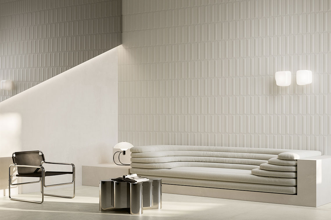 Avec Piuma, Fioranese interprète la couleur de l’année à travers le relief et la lumière, transformant la surface céramique en un élément architectural capable de donner du rythme à l’espace, de manière mesurée mais profondément contemporaine.