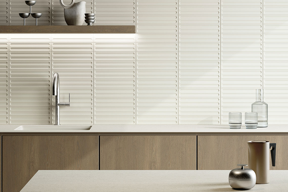 Dans la cuisine, Piuma peut être interprétée comme une boiserie contemporaine, à la fois fonctionnelle et décorative. Le rythme vertical du relief scande les murs avec une précision graphique, tandis que la couleur inspirée du Pantone 2026 crée une atmosphère lumineuse, sobre et accueillante. L’effet global est celui d’un espace ordonné et cohérent, dans lequel la céramique assume un rôle central dans le projet, dialoguant avec des surfaces lisses et des matériaux complémentaires. Piuma devient ainsi un outil pour dessiner l’espace, idéal pour des cuisines et des espaces de vie contemporains où le revêtement n’est plus un simple arrière-plan, mais un élément actif du langage architectural.